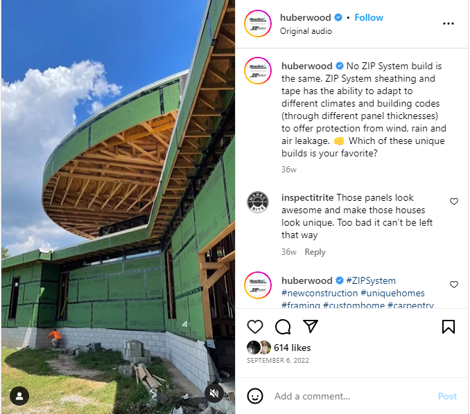 Here’s an example of how to use existing photography to tap into a relevant trend. Huber Engineered Woods jumped onto the Owen Wilson “Wow!” trend by showcasing some of their jaw-dropping Zip System® builds.