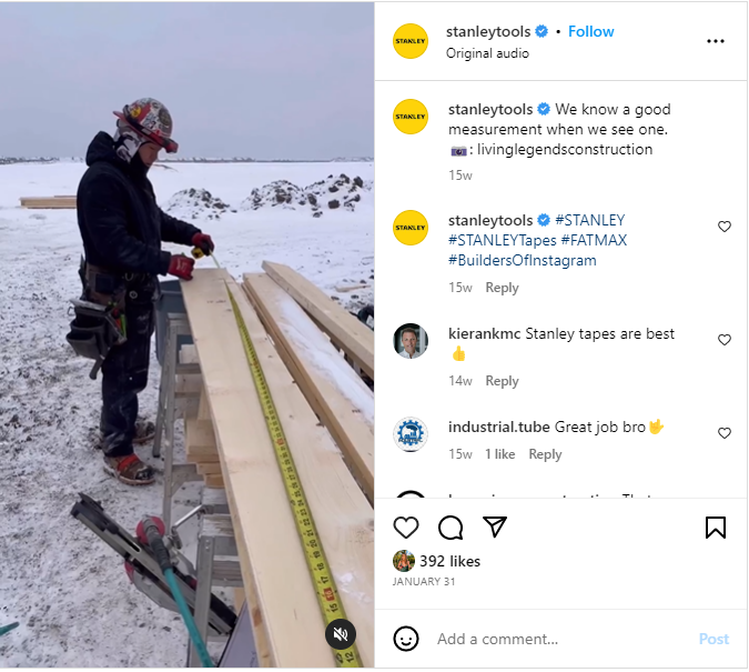 Here’s an example from Stanley Tools, which often repurposes UGC content for TikTok and Instagram.